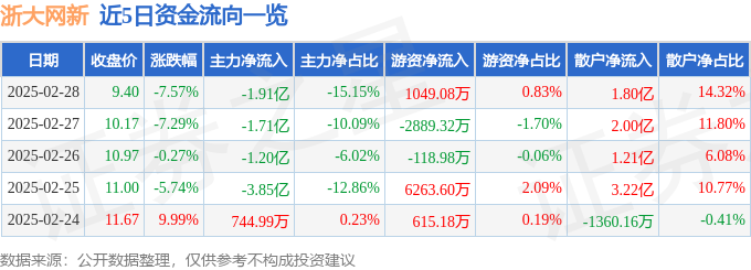 本站音信,适度2025年2月28日收盘,浙大网新(600797)报收于9.4元,下落7.57%,换手率12.68%,成交量130.26万手,成交额12.6亿元。